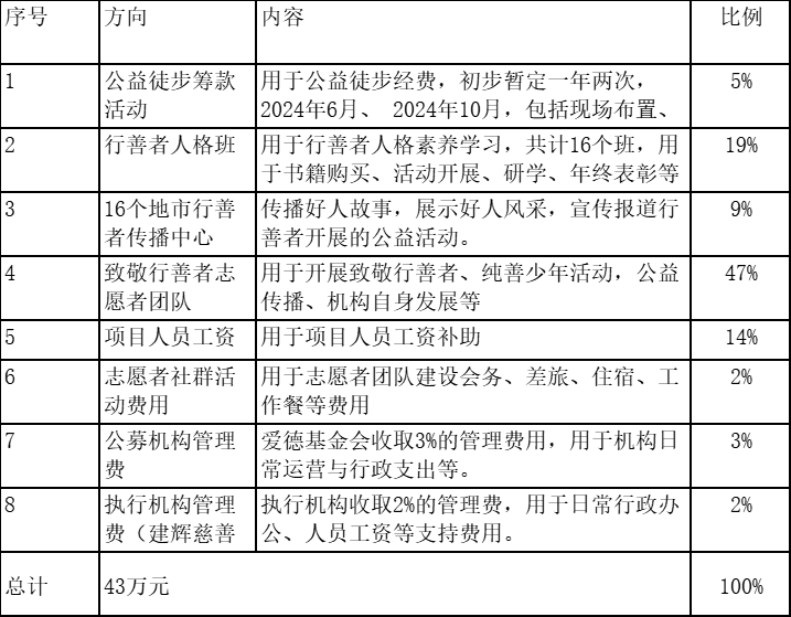 • 提升安徽区域行善者行善能力,为纯善少年开展深层次、多维度服务,提升安徽善之源志愿者团队整体发展能力,并通过公益徒步、为爱行走等方式筹款。