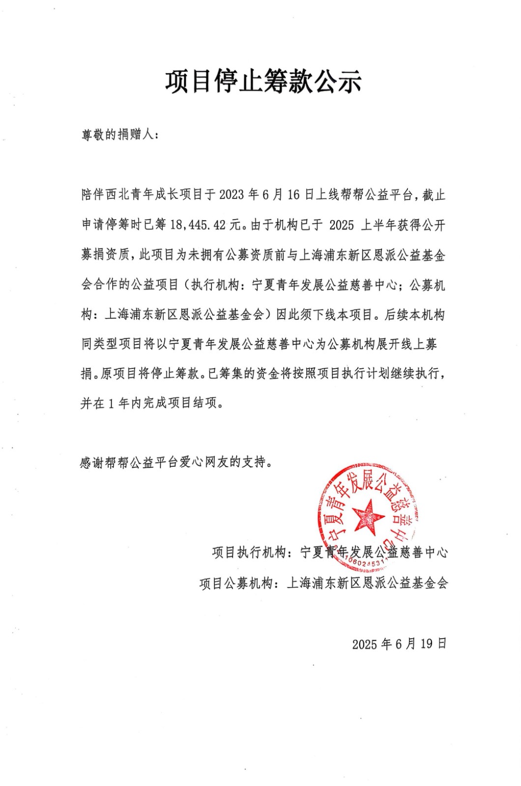 陪伴西北青年成长项目于2023年6月16日上线帮帮公益平台,截止申请停筹时已筹18,445.42元。由于机构已于 2025 上半年获得公开募捐资质,此项目为未拥有公募资质前与上海浦东新区恩派公益基金会合作的公益项目(执行机构:宁夏青年发展公益慈善中心;公募机构:上海浦东新区恩派公益基金会)因此须下线本项目。后续本机构同类型项目将以宁夏青年发展公益慈善中心为公募机构展开线上募捐。原项目将停止筹款。已筹集的资金将按照项目执行计划继续执行,并在1年内完成项目结项。
