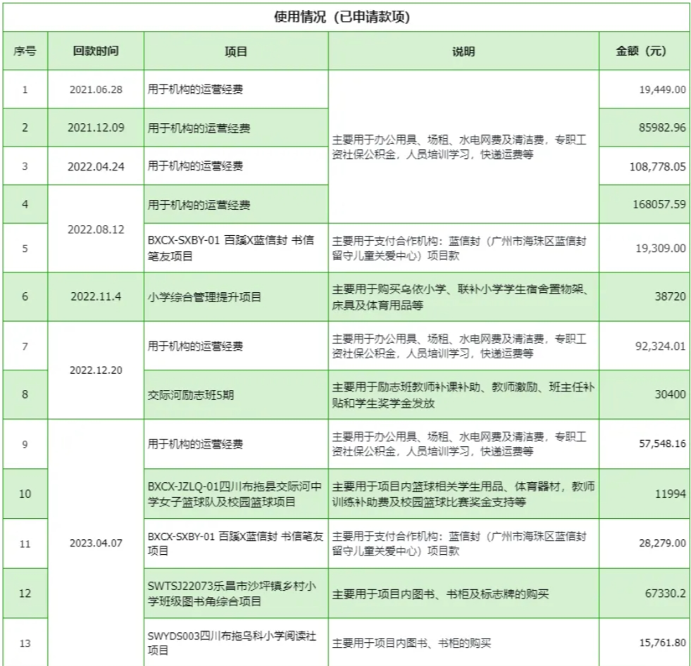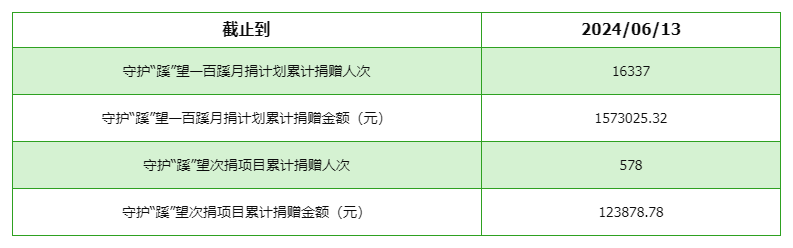 截至2024年6月13日,守护“蹊”望—百蹊月捐计划累计捐赠人次为16337人,累计捐赠金额1,573,025.32元;守护“蹊”望次捐项目累计捐赠人次为578人,累计金额共123,878.78元。 |