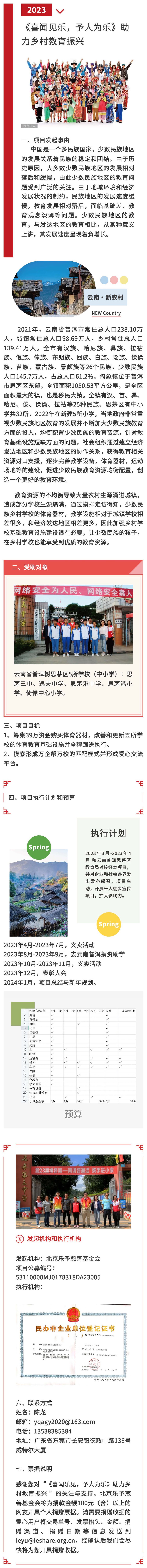 针对乡村小于发展不均衡不充分的问题,东莞市益启爱公益服务中心联合北京乐予慈善基金会西部温暖计划于2023年3月发起《喜闻见乐,予人为乐》助力乡村教育振兴项目,通过筹款义卖的形式筹集39万资金购买体育器材,改善和更新五所学校的体育教育基础设施并全程跟进执行。