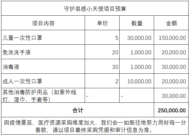 北京新阳光慈善基金会儿童舒缓治疗专项基金携手各界爱心人士,联系社会企业和商家,准备为血液病和肿瘤患儿家庭采购消毒防护用品,如儿童口罩、成人口罩(家长用)、免洗洗手消毒液、消毒湿巾、紫外线消毒器、家居消毒液等,为容易感染等小天使们筑起守护的屏障,隔离病毒,远离感染。
