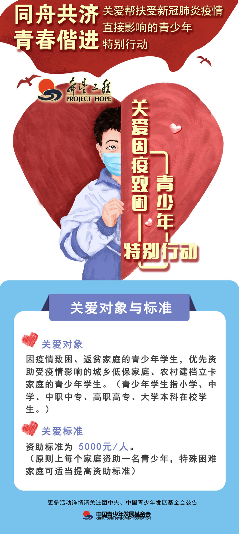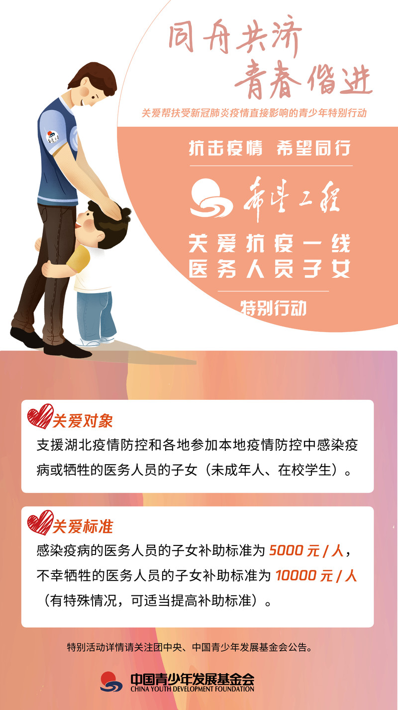 中国青基会、各省级青基会对符合条件的因疫致困青少年、抗疫医务人员子女提供资助或补助。