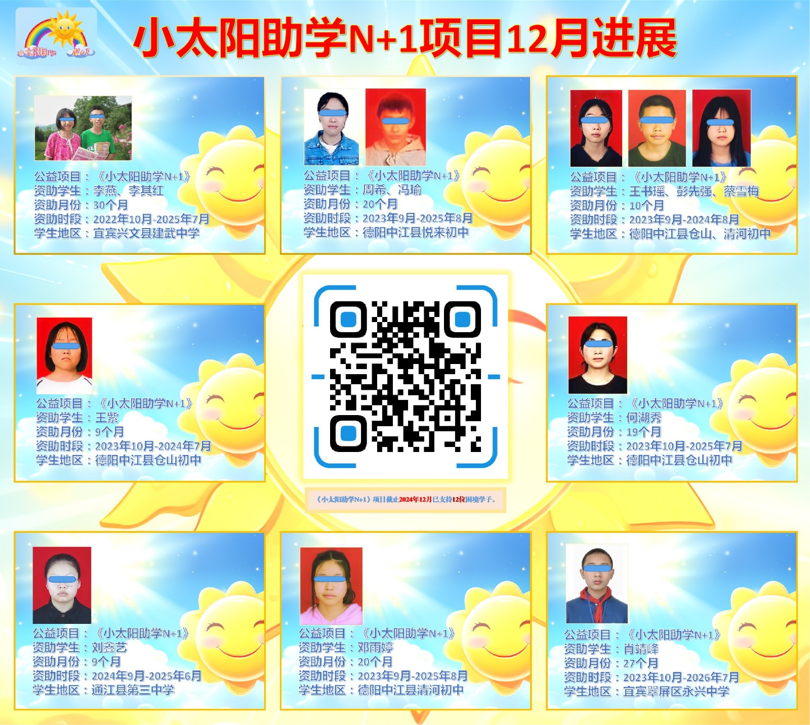 截止2024年12月,小太阳公益团队《小太阳助学N+1》项目组共支持了12位困境家庭的在校学子。本月正常资助8位。总资助157个月份、拨付资助金62800元。