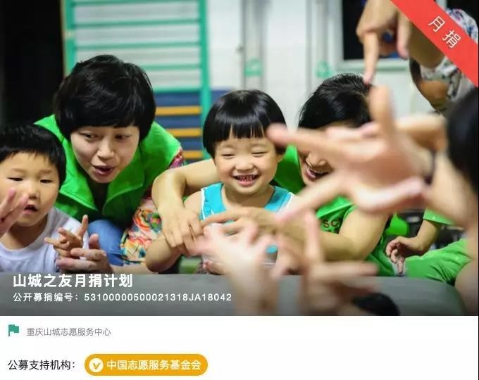 【重庆山城志愿者服务中心从2018年12月份正式推出山城志愿者的“山城之友”月捐计划。山城之友,亦是山城志愿者的资助人;希望通过寻找“山城之友”,支持山城志愿服务中心发展,帮助更多需要关爱的人。】