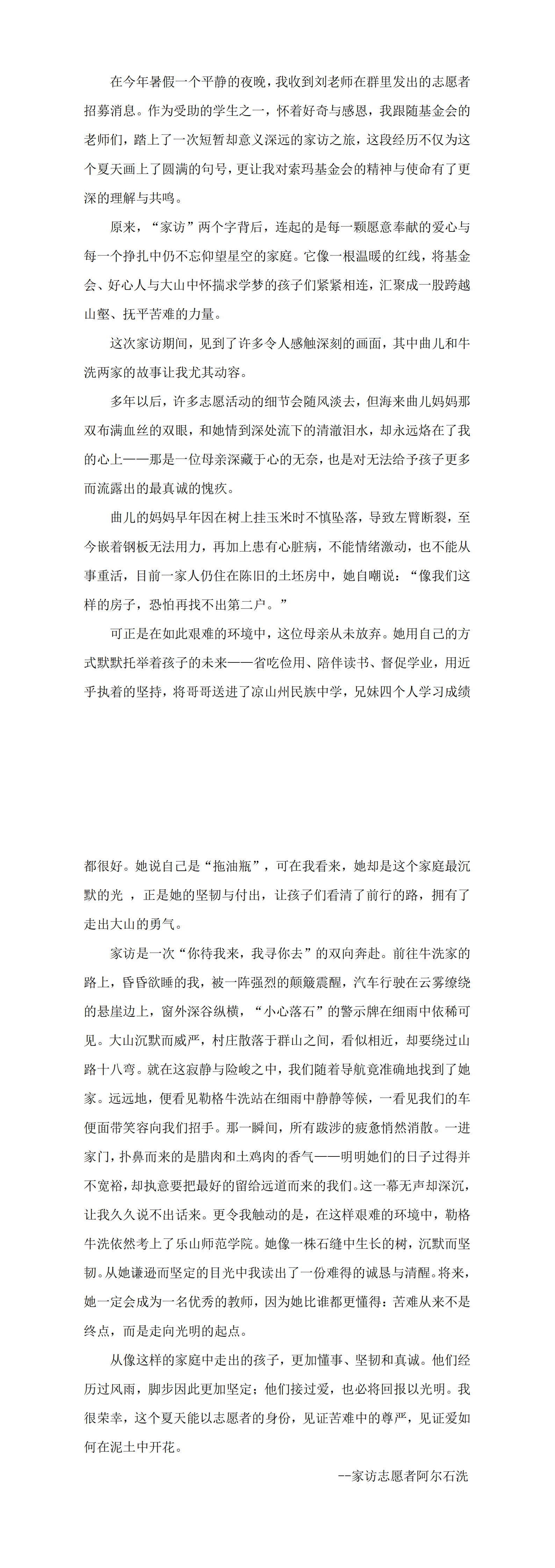 受助索玛学生石洗同学参加了本次的志愿家访活动,她在她的家访日记中写道“家访是一次‘你待我来,我寻你去’的双向奔赴”,虽然石洗家也是单亲妈妈带着4个读书的孩子,家中还有三个大学生,但在家访的过程中仍有她为之动容的故事。曲儿家母亲身体差,父亲挣钱供养六个孩子读书,牛洗家父母年岁已高无收入来源,但牛洗仍靠着自己顽强的意志考入大学,这些场景仍历历在目,多年以后这些场景仍会记录在她的心间,她也在家访记中写道:正是他们经历过风雨,脚步因此更加坚定;他们接过爱,也必将回报以光明。
