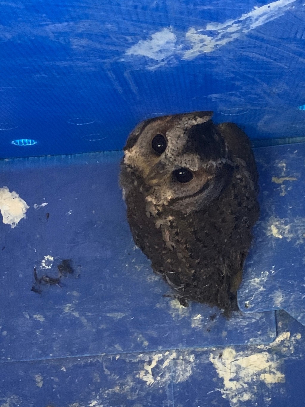 图 4 2026年1月11日,古城派出所向中心移交一只领角鸮。该个体完全被粘在粘鼠板上,脚底下死死抓着先于它被粘住的老鼠。虽将粘胶洗掉但因吞下部分粘胶死亡。 |