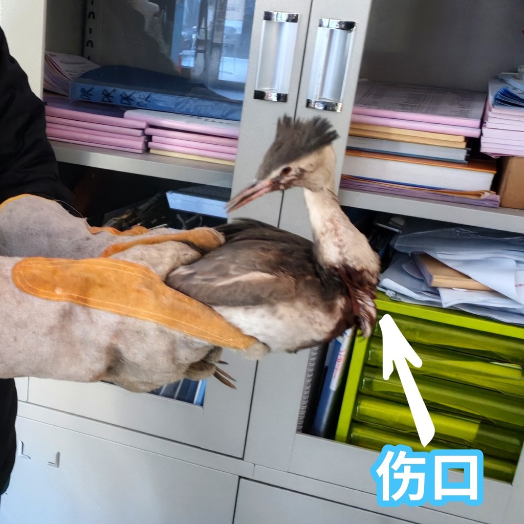 图 7 2026年1月21日晚,接收到一只疑似被猛禽袭击的凤头䴙䴘。于第二天死亡。 |