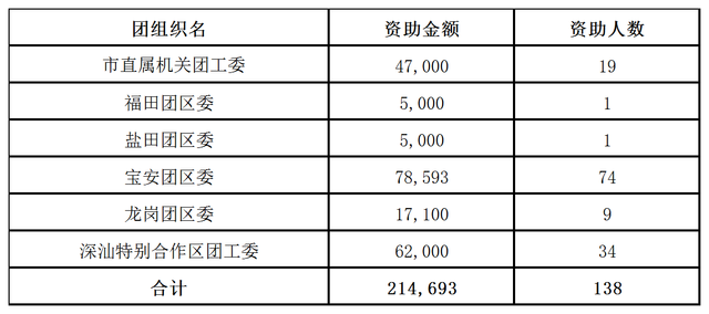 2023年第四季度(10月至12月)深圳市青少年帮困助弱专项基金共计支出214,693元,直接资助困弱青少年138名,资助范围覆盖宝安团区委、深汕特别合作区团工委等6个团组织,各团组织详细资助金额及人数见下图所示。