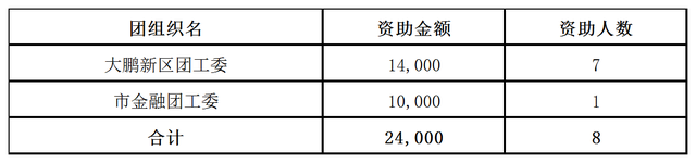 2024年第一季度(1月至3月)深圳市青少年帮困助弱专项基金共计支出24,000元,直接资助困弱青少年8名,资助范围覆盖大鹏新区团工委、市金融团工委等2个团组织,各团组织详细资助金额及人数见下图所示。