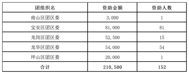2024年第二季度(4月至6月)深圳市青少年帮困助弱专项基金共计支出210,500元,直接资助困弱青少年152名,资助范围覆盖宝安区团区委、龙华区团区委等5个团组织,各团组织详细资助金额及人数见下图所示。