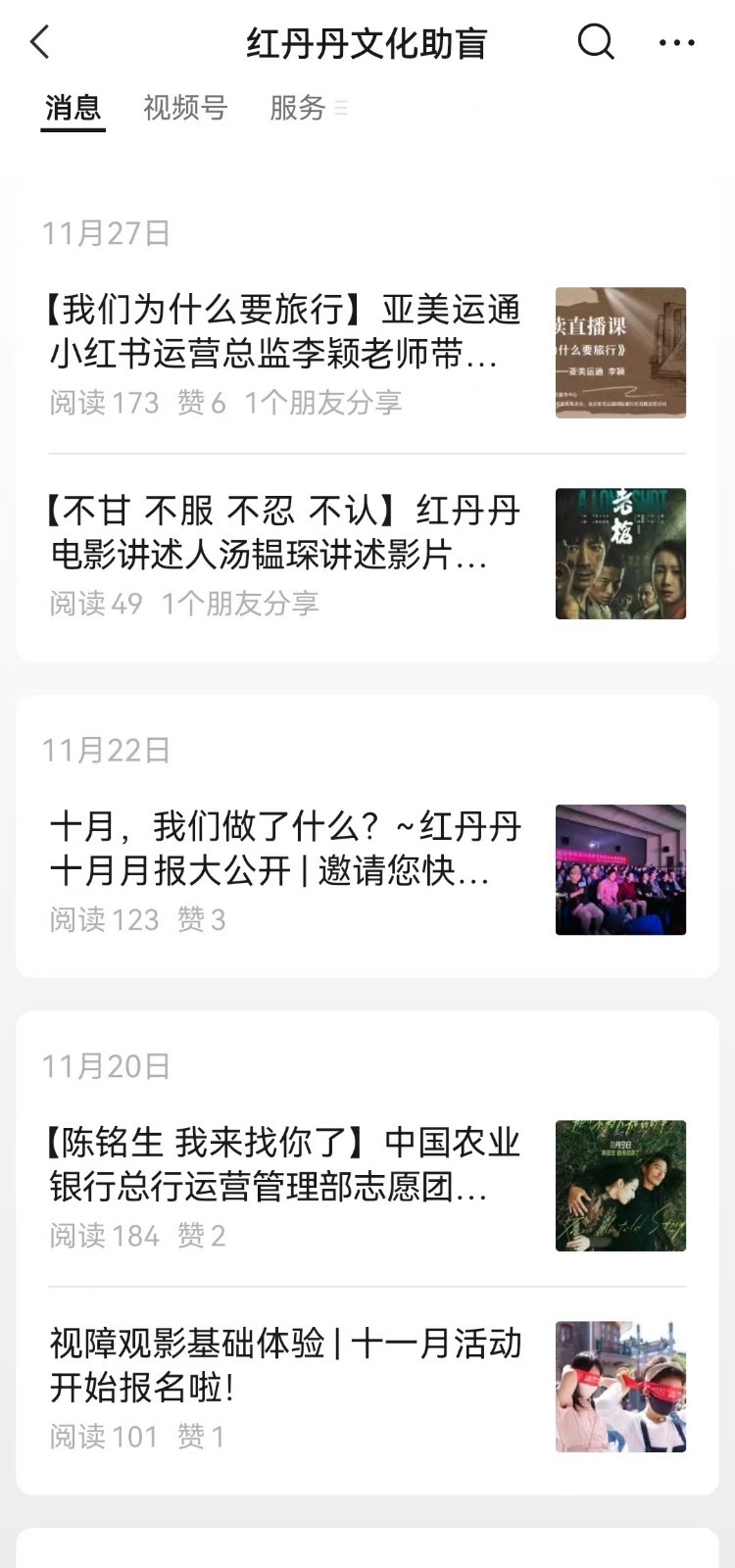 “红丹丹文化助盲”微信公众号推文20篇,浏览量5476次。