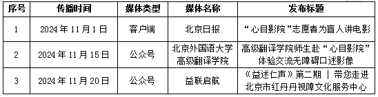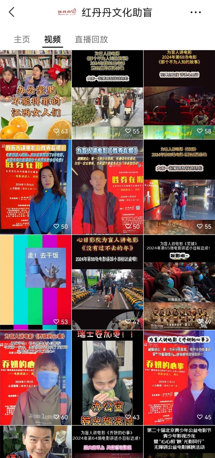 其他平台:“红丹丹文化助盲”微博、“心目影院”微博、快手号等同步转发相关内容,向志愿者、视障朋友、合作伙伴、捐赠人及社会公众展示工作动态和成果,传递助盲理念和价值观。 |