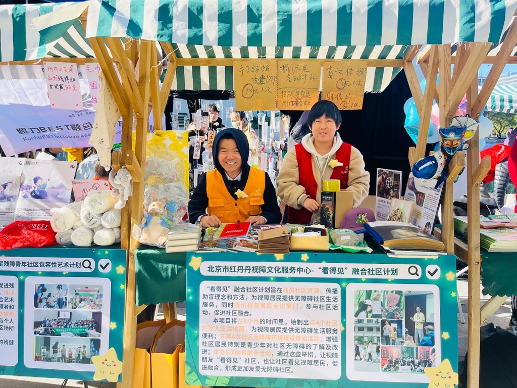 活动当天,恶劣的天气并没有阻挡住大家的热情。从中午时分一直到晚上七点,红丹丹的工作人员和视障朋友们始终坚守在公益摊位前,全情投入地向过往的公众展示意义深远的“看得见”融合社区计划。