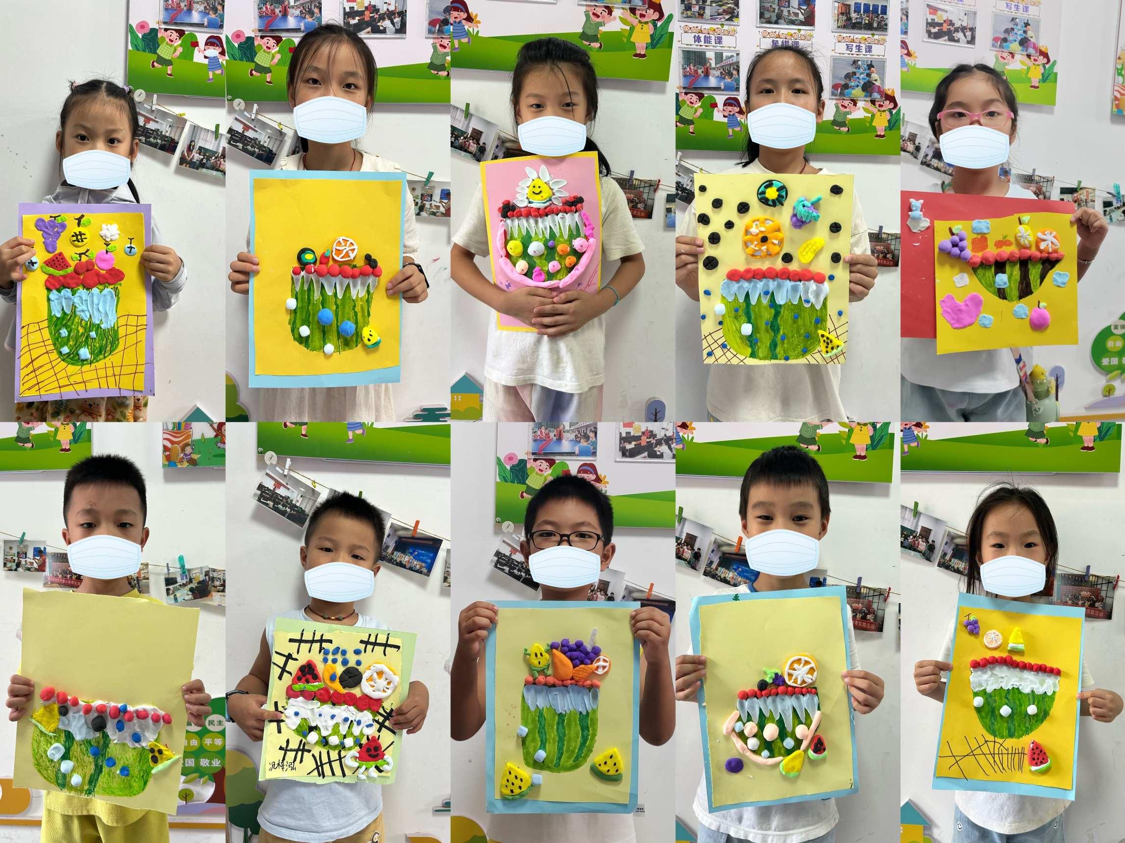 随后孩子们用彩笔画出西瓜冰沙的模样,五彩粘土塑造出西瓜果肉的鲜艳纹路和奶油的绵密质感,自由添加其他水果、冰块、吸管等细节,让作品充满个性与清凉感。在童心港湾的课堂里,没有标准答案的创作,让每个孩子都成了“小艺术家”。就像这杯不会融化的“冰沙”,不怕“做不好”,只管大胆想、动手试。
