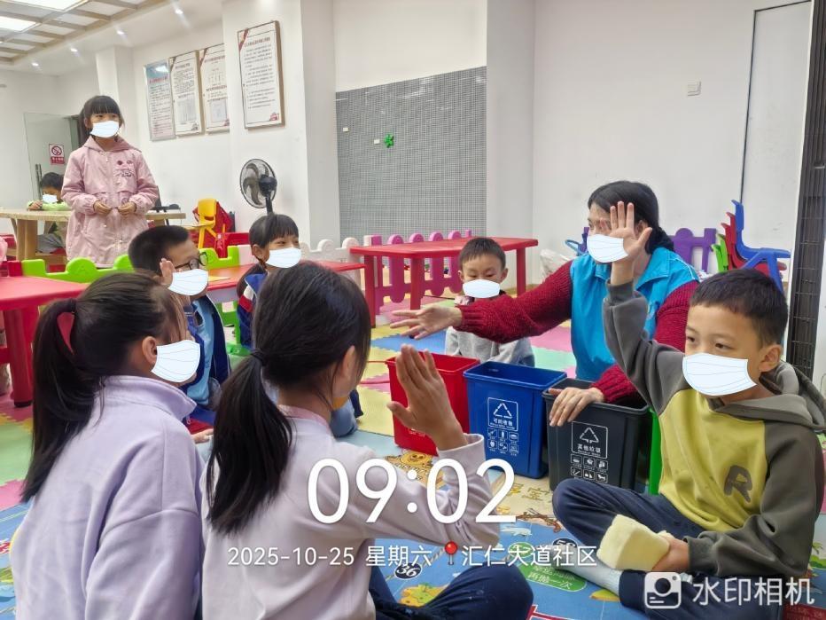 2. 2025年10月25日上午,汇仁大道社区童心港湾举行垃圾分类“童”参与,环保理念润童心的活动,通过趣味互动让环保理念深植儿童心中。