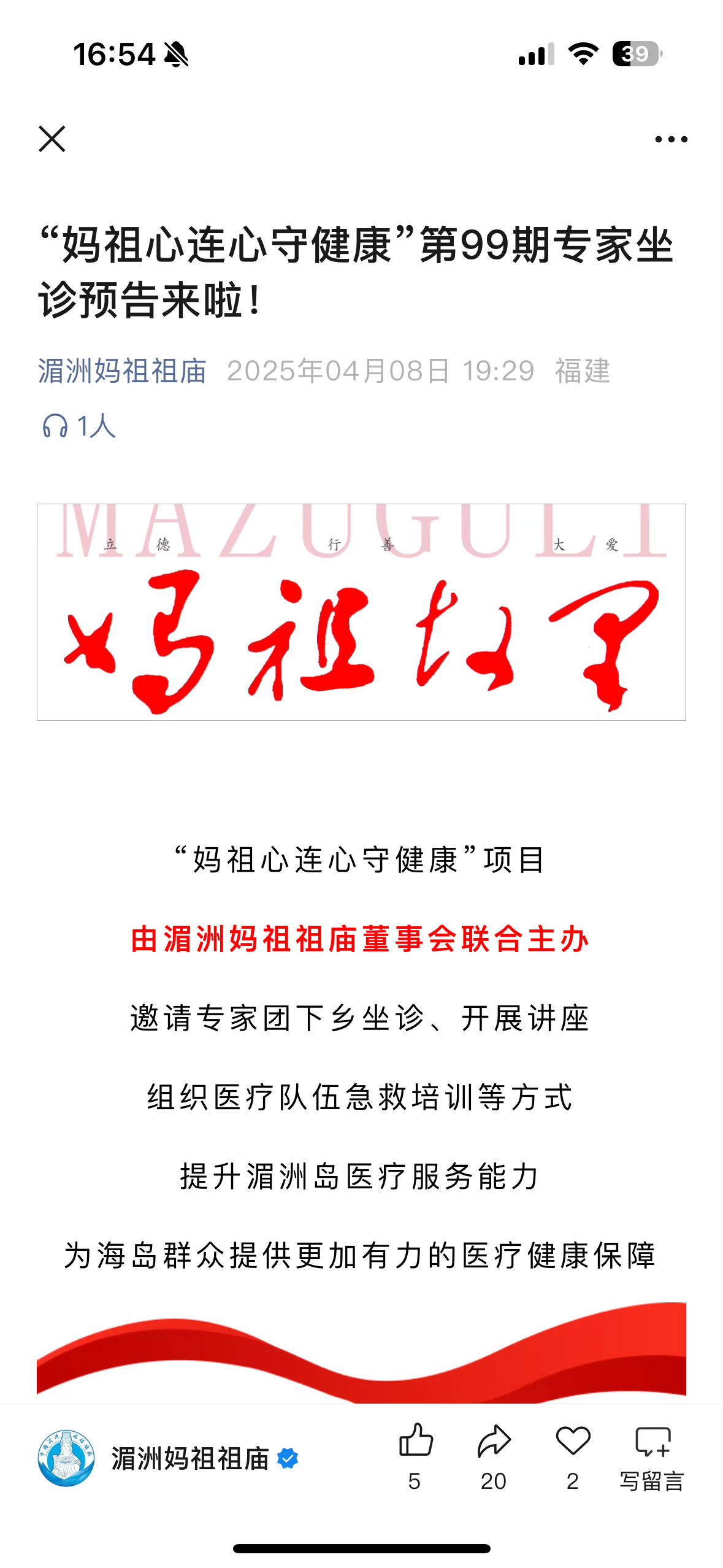 “妈祖爱医路随性——促优质医疗资源下沉湄洲”项目旨在提升湄洲岛医疗水平、助力海岛居民健康福祉的公益活动,此次公开募捐活动筹集的资金主要用于开展“妈祖心连心守健康”周末专家赴湄洲岛坐诊各项费用。2025年8月14日,该项目共筹得资金1元,没有进展,距目标款项相差较多,线上筹款成效不佳,目前由基金会继续捐赠开展该活动一年,到期后再行商议。