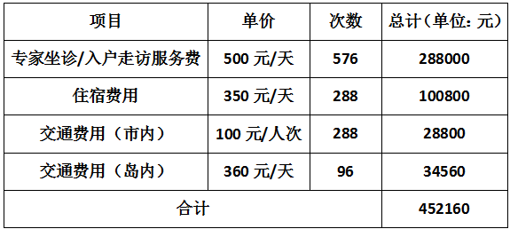 注:专家坐诊/入户走访服务费:副高级职称400元/天;正高级职称500元/天。(一个月按4周计算,每周约6个专家团医师,预算按正高级职称。)