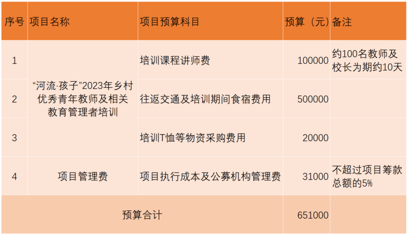 备注:若筹款总额超出上述项目执行预算,剩余善款将用于2023年“河流·孩子”助学计划项目学校的物资捐赠及其他与“河流·孩子”相关的教育扶贫项目。
