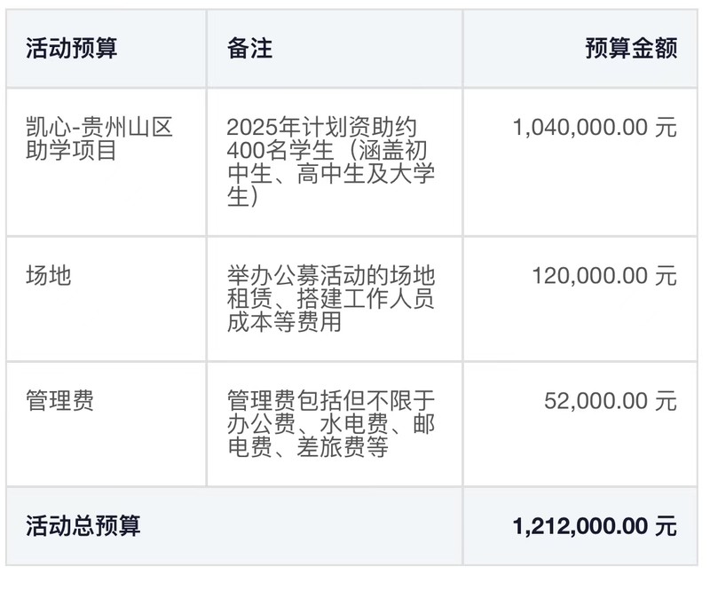 此次公募所得将用于贵州四所学校:施秉县施秉民族中学、施秉县第二中学、谷硐中学和坝芒中学的在校家庭经济困难且品学兼优的同学,预计将帮助400人。