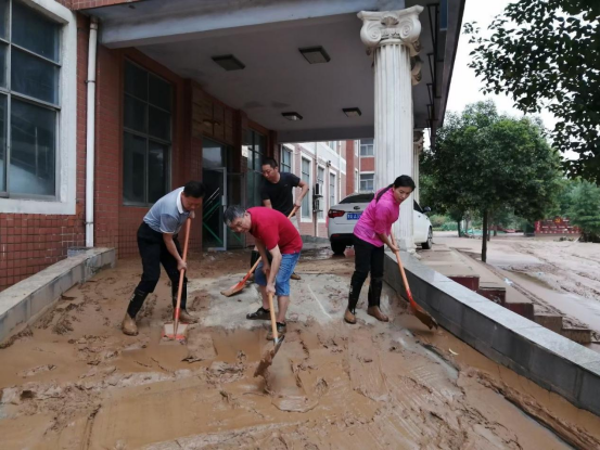 (巩义市米河镇小里河小学的老师们,正在清理学校的淤泥,图片已授权)