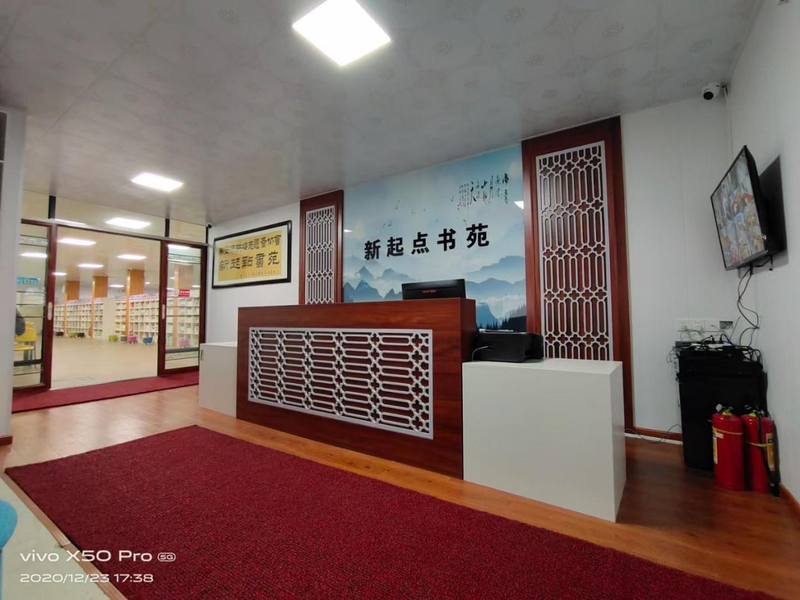 图书馆内可同时容纳读者300人,配备独立饮水室、多媒体室,功能阅读区,配套专用电梯、直饮水机、多媒体系统、电子借阅系统、电子阅读机、空调、桌椅等硬件设施,经过一年的的运营,新起点书苑已逐步进入良性发展阶段。