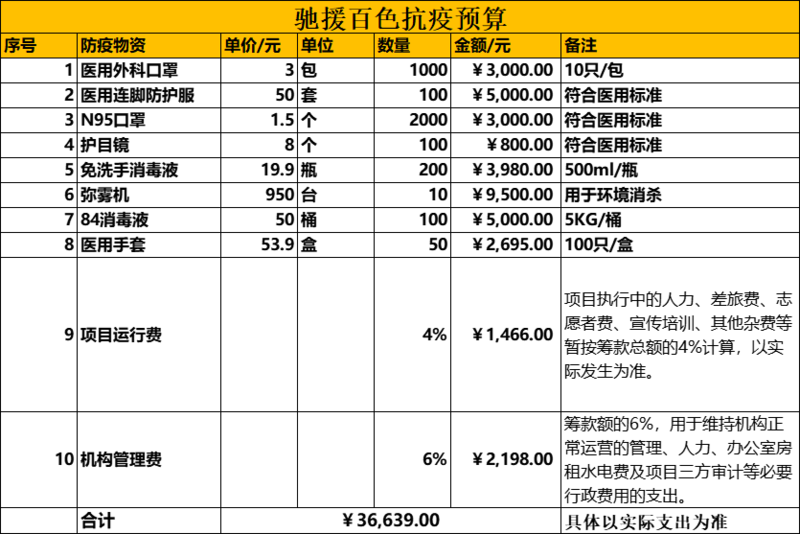 善款用途:由扬帆计划负责为百色市购买防疫物资。