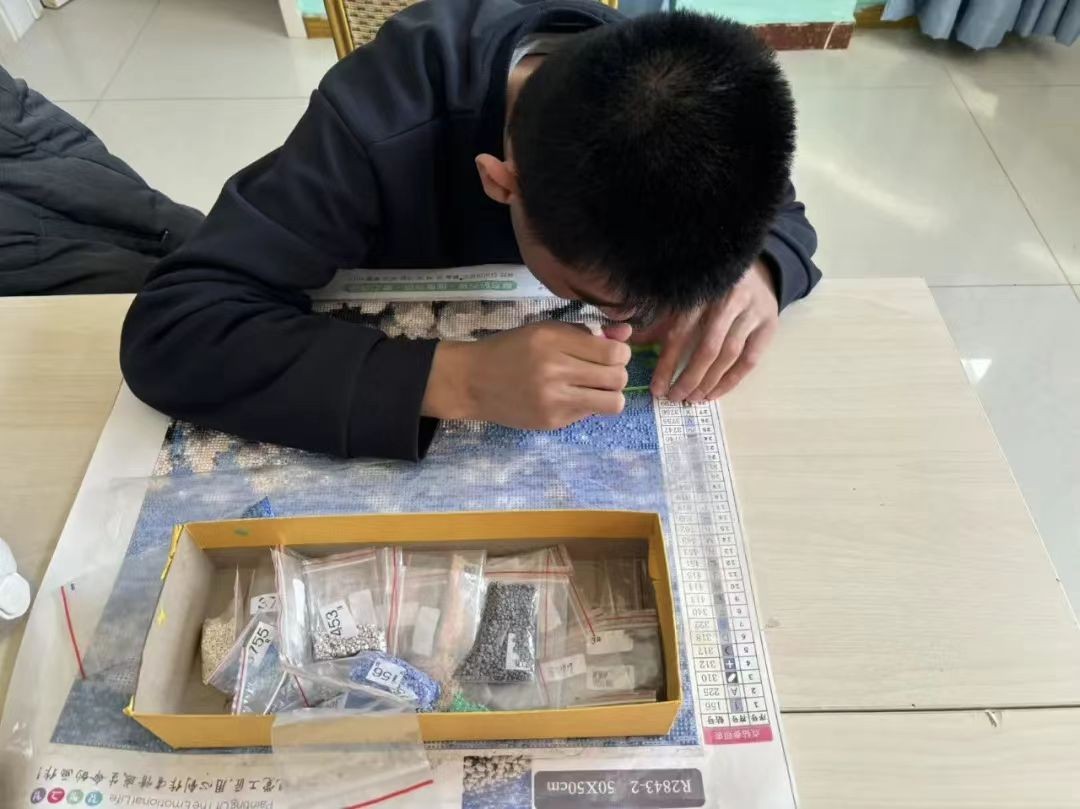 小举对钻石画粘贴有着浓厚的兴趣,初次拿到钻石画,小举看着满是陌生数字和符号的图纸,一头雾水。对数字不熟悉的他,拿着点钻笔,手心出汗。找钻时,相似数字总让他混淆,钻也常贴错位置。后来小举不甘示弱,每天就坐在手工桌前,专心致志地研究数字与钻的对应关系。他拿出纸笔,一遍又一遍地抄写图纸上的数字,反复记忆,加上在老师的帮助与指导下,现在能够精准的找到钻的位置且粘贴的标准,一幅粘贴完整的钻石画对小举来说已经不成问题啦!