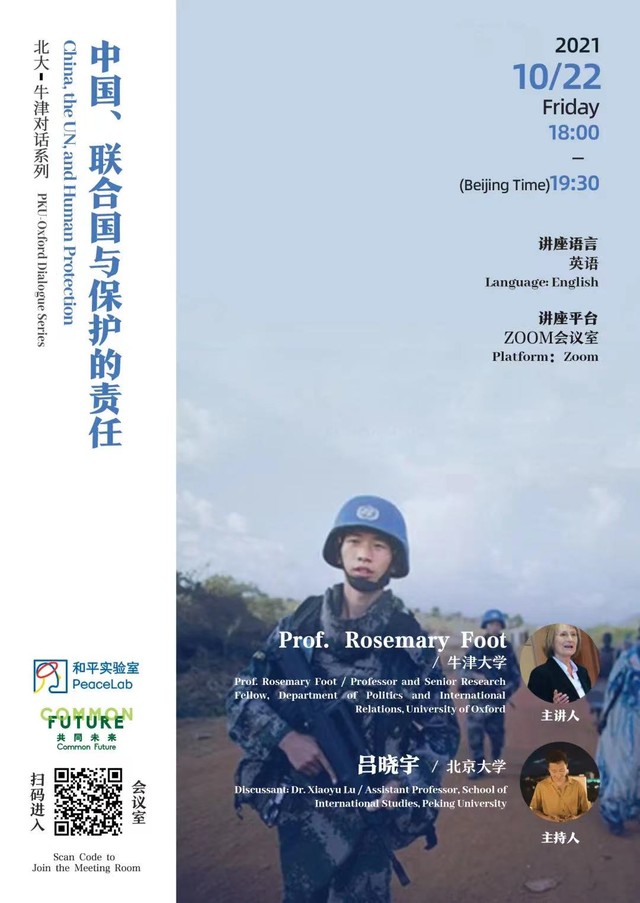 “北大-牛津对话系列”由北京大学国际关系学院的“和平实验室”发起,旨在促进冲突与和平方面的研究和政策参与。此系列活动是北京大学和牛津大学学术交流活动的一部分。本次为“对话系列”的第四期。本次对话将基于 Rosemary Foot 教授于2020年出版的新书 China, the UN, and Human Protection: Beliefs, Power, Image 展开。点击查看详情