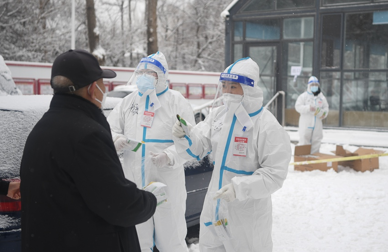 (图片为松原市防疫工作者在雪中开展核酸检测工作)