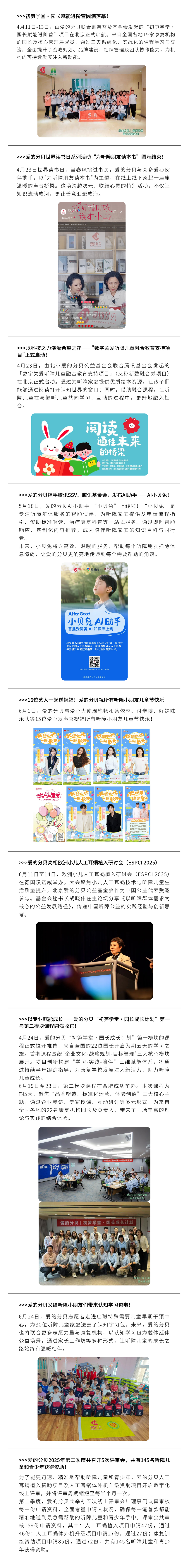 夏日初临,蝉鸣渐起,我们迎来了全国助残日与六一儿童节这两个承载着关爱与希望的日子,爱的分贝始终与听障朋友们携手同行,用心为听障伙伴们编织有声的希望,让成长的乐章更加响亮!一起来看看小分贝在这三个月里,为听障朋友们播撒了哪些阳光与力量吧!