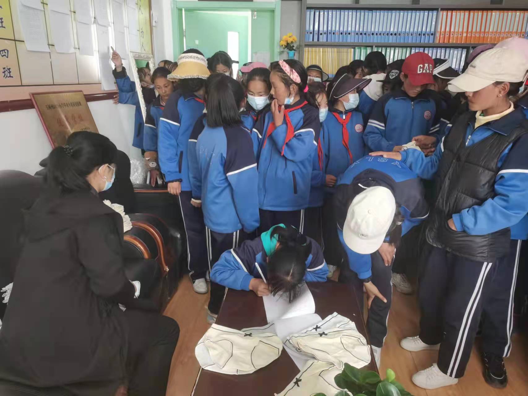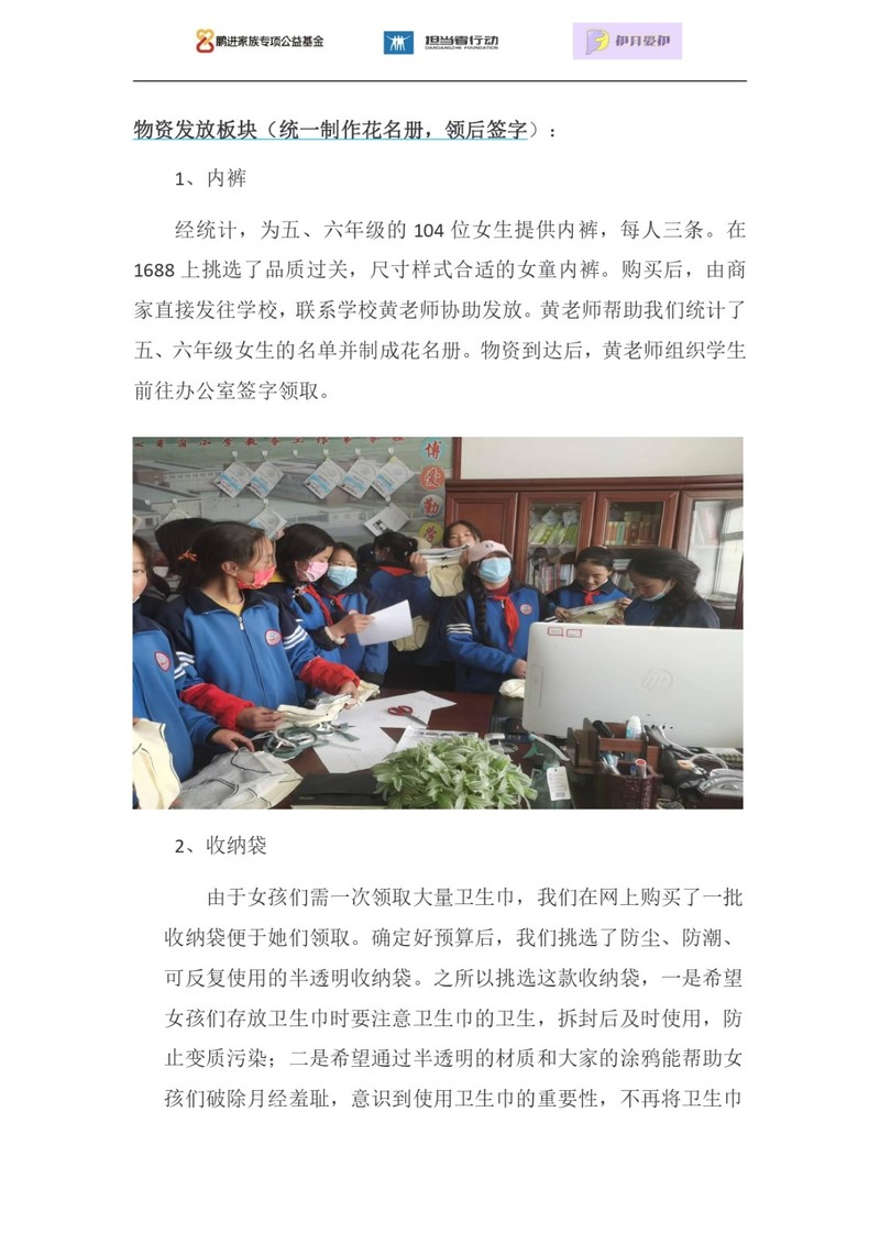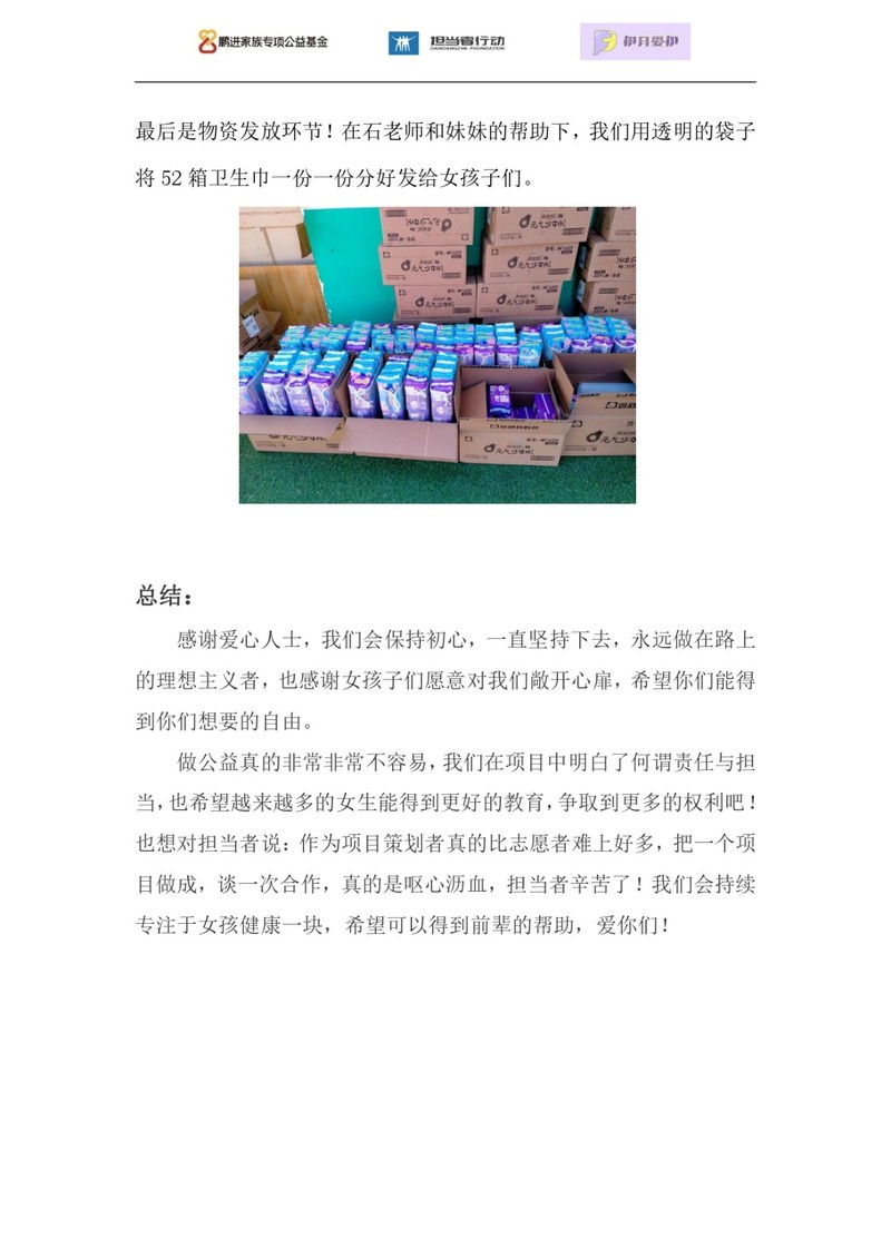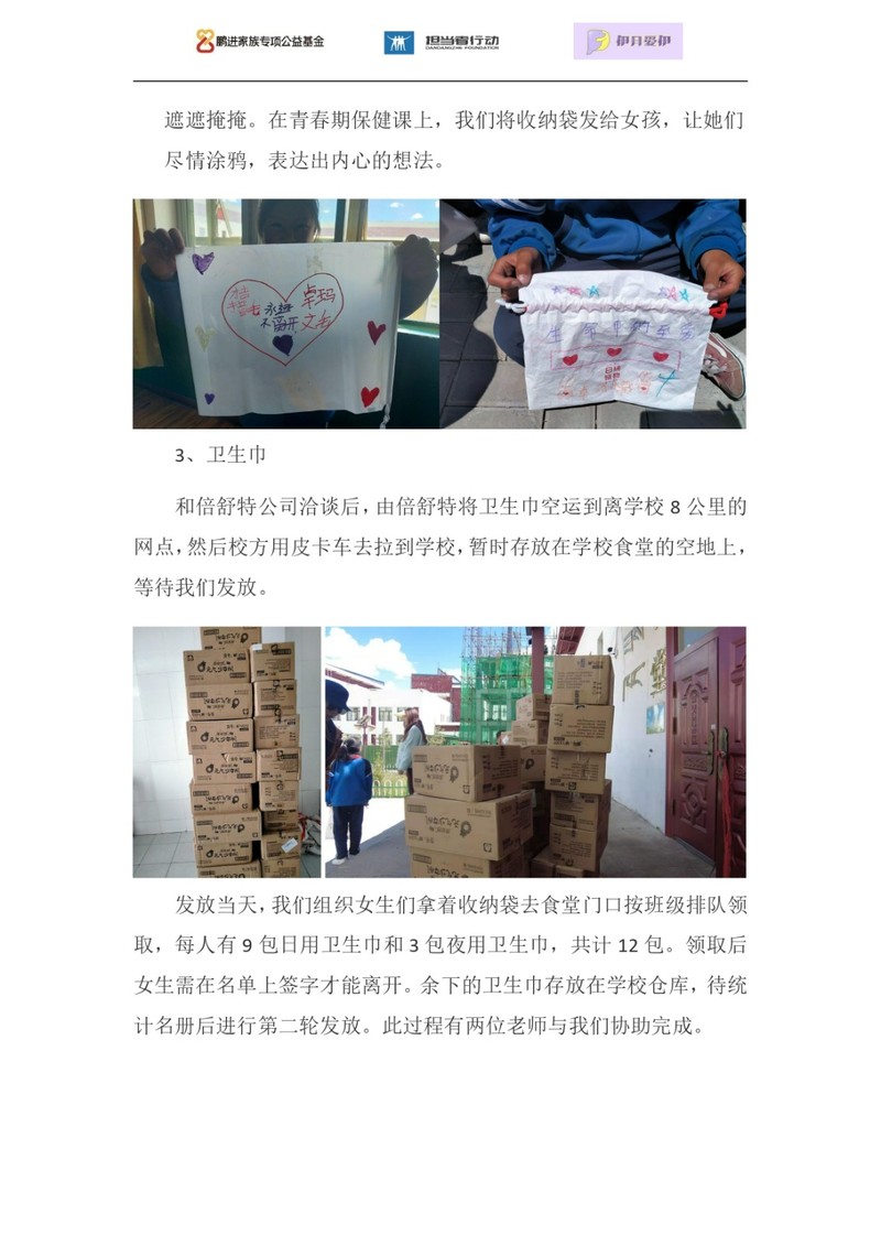 团队为五年级全体女生发放了由倍舒特公司赞助的卫生巾,并将剩下的卫生巾放入教务仓库,留给其他有需要的同学。