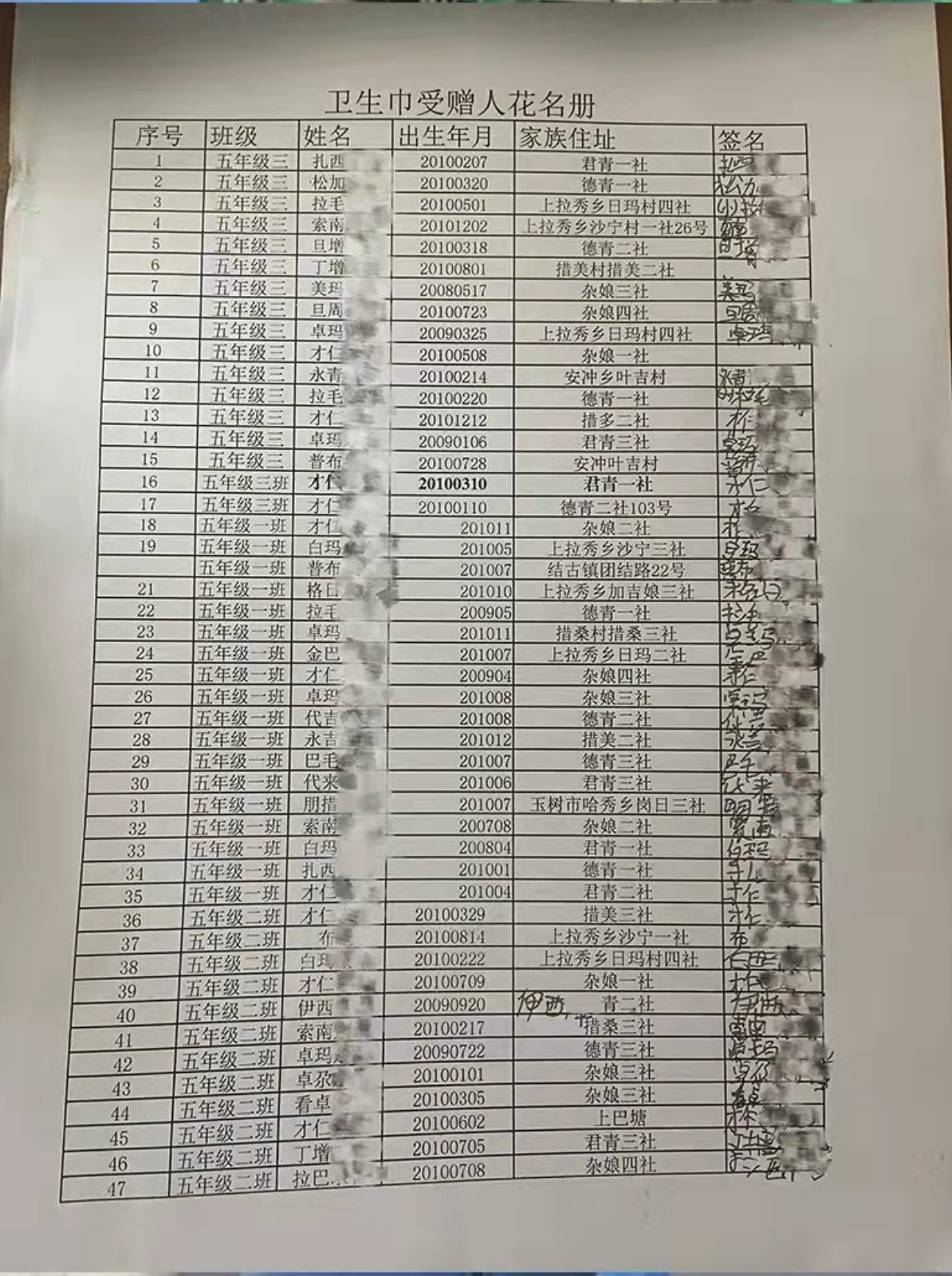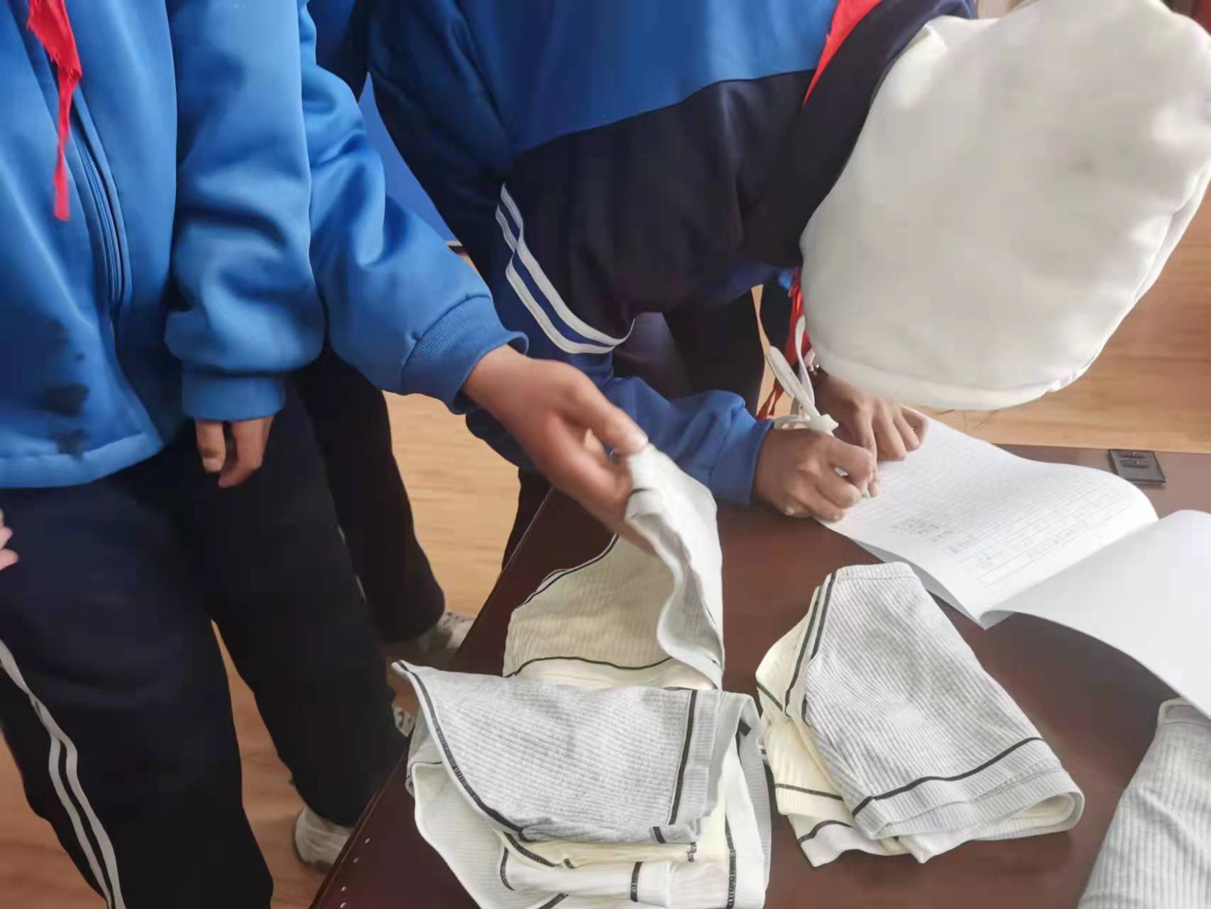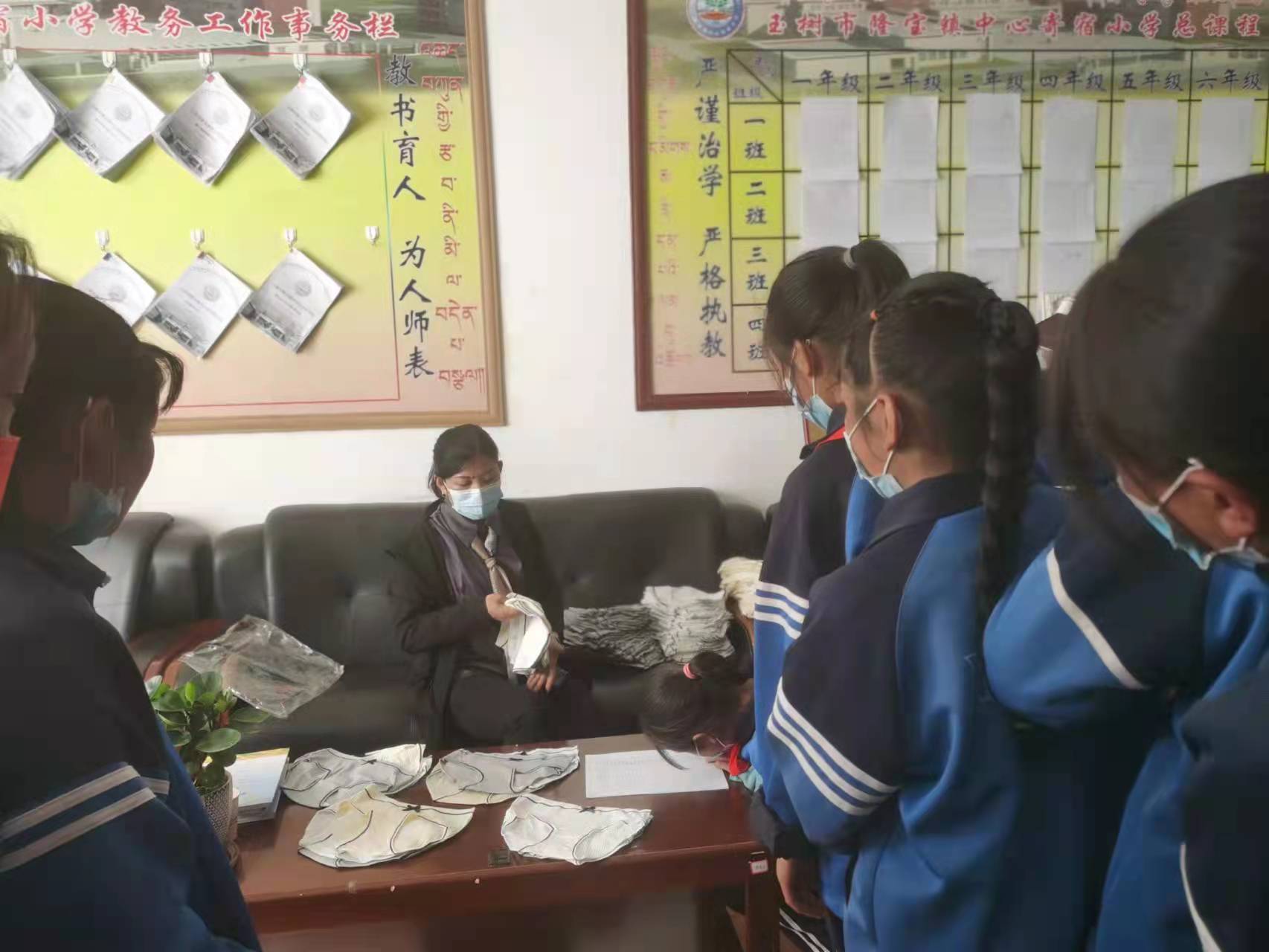 团队为五年级全体女生发放了由倍舒特公司赞助的卫生巾,并将剩下的卫生巾放入教务仓库,留给其他有需要的同学。