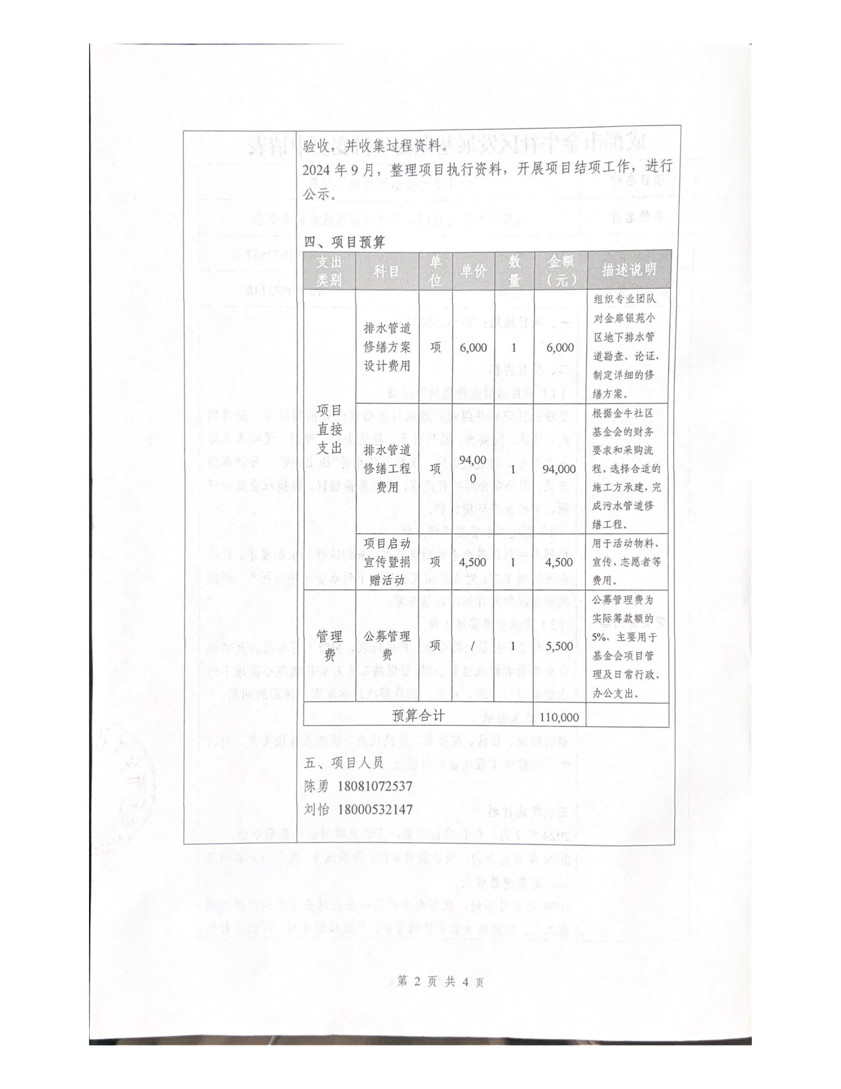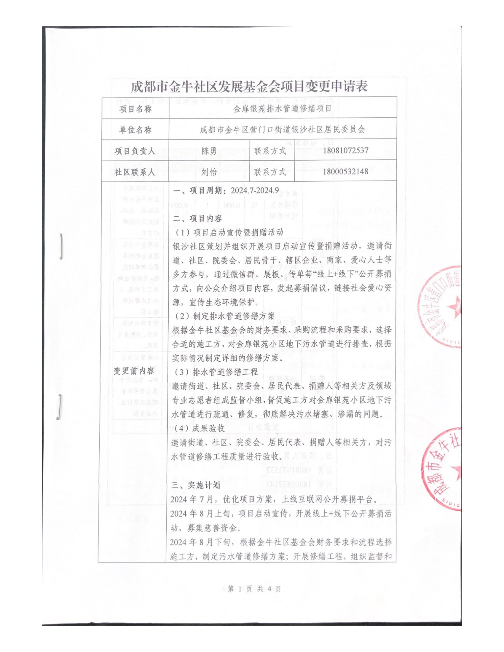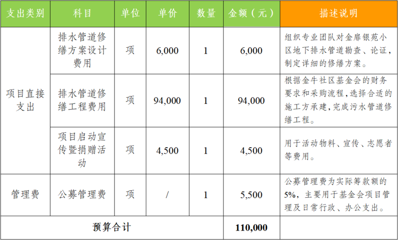 2024年8月下旬 根据金牛社区基金会财务要求和流程选择施工方,制定污水管道修缮方案;开展修缮工程,组织监督和验收,并收集过程资料。