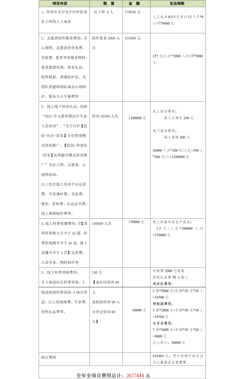 2、资助合作医院安宁疗护团队筹建及支付培训及认证相关费用;