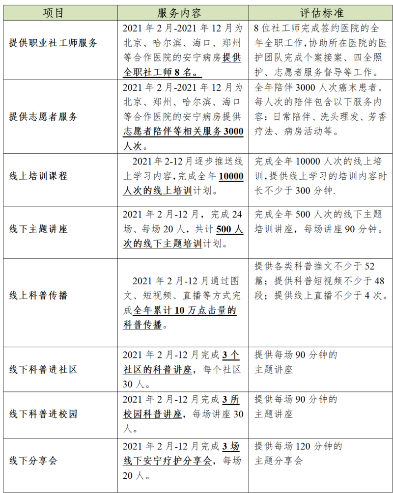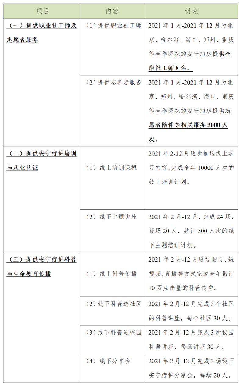 第一大核心目标:提供安宁疗护医务社工师、心理师、志愿服务为每一家符合要求的合作医院提供一位职业社工师,作为督导员带领稳定的志愿者团队为患者进行服务。